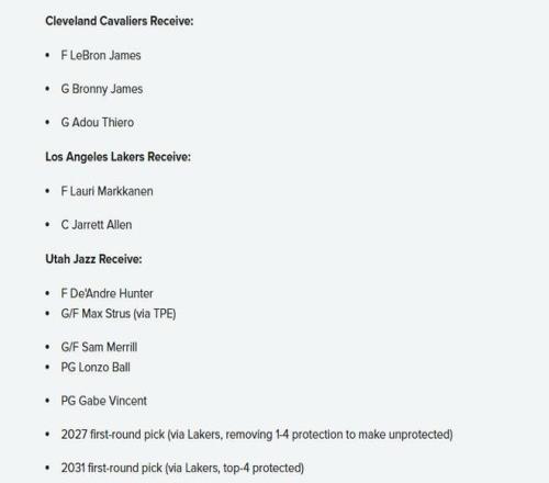 爵士得到:亨特、斯特鲁斯、梅里尔、鲍尔、文森特、湖人2027年首轮签、湖人2031年首轮签